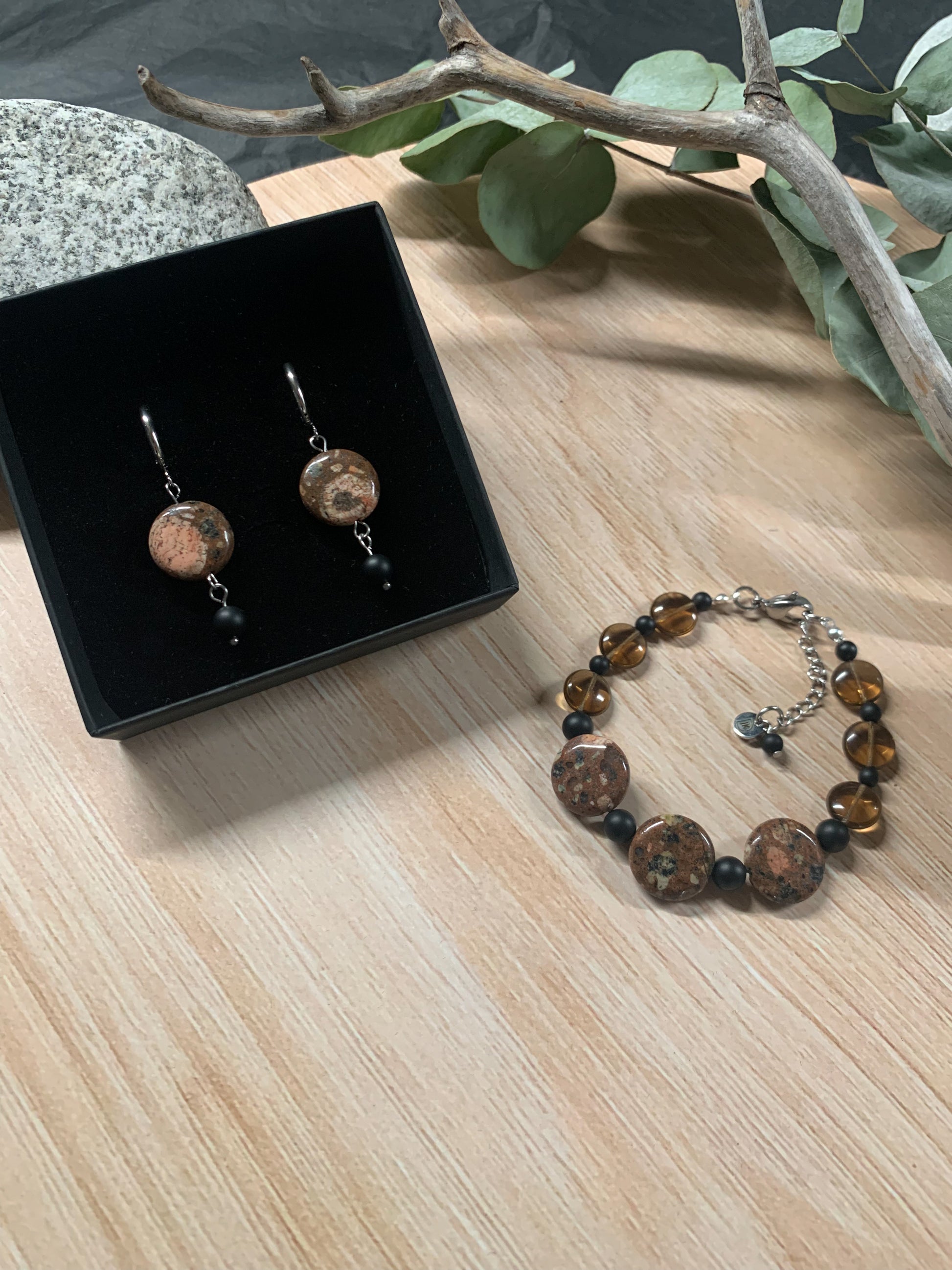 The jewelry uses genuine natural gemstones Agate and Obsidian. The metal parts are made of high-quality, hypoallergenic surgical steel.