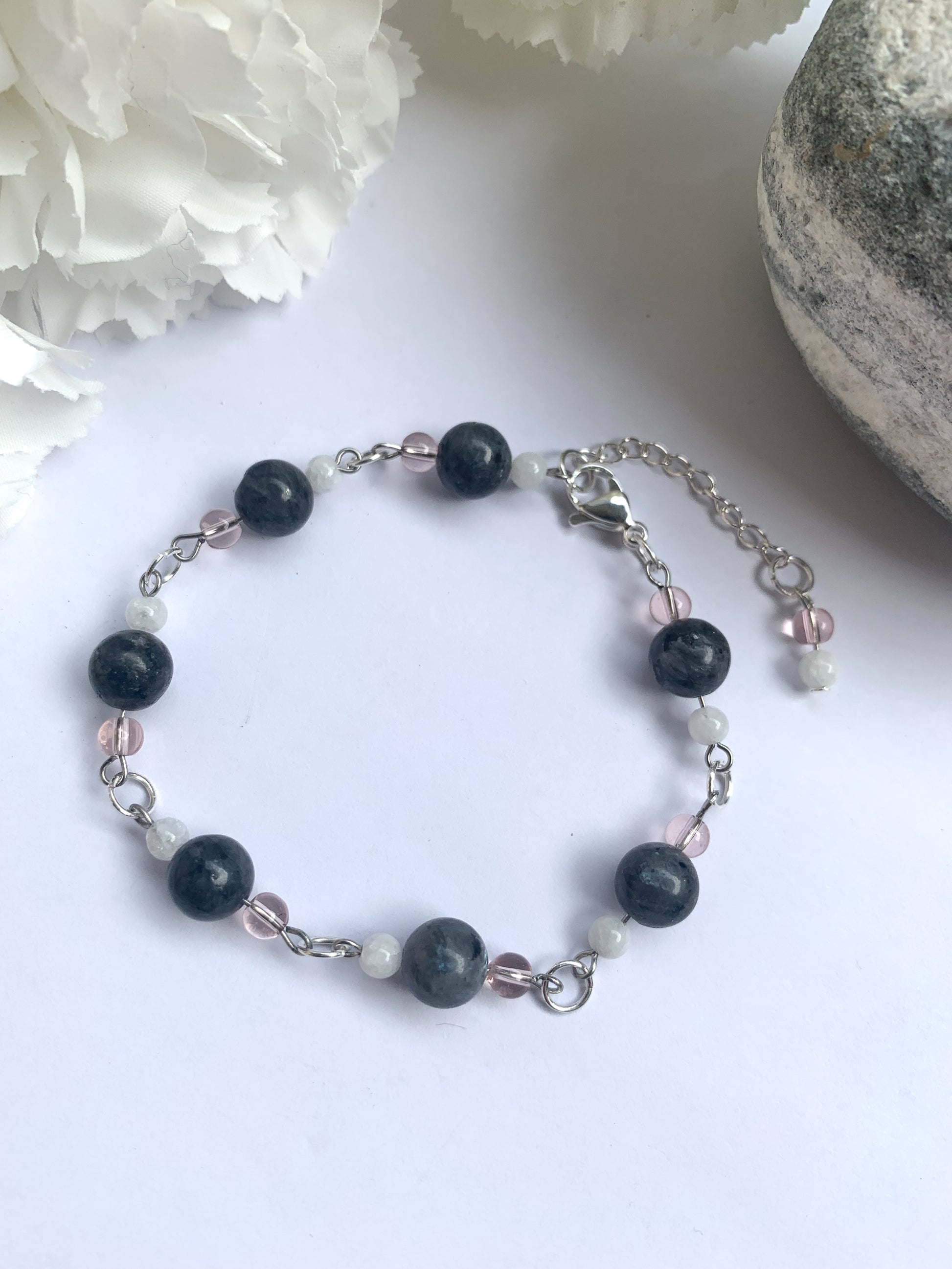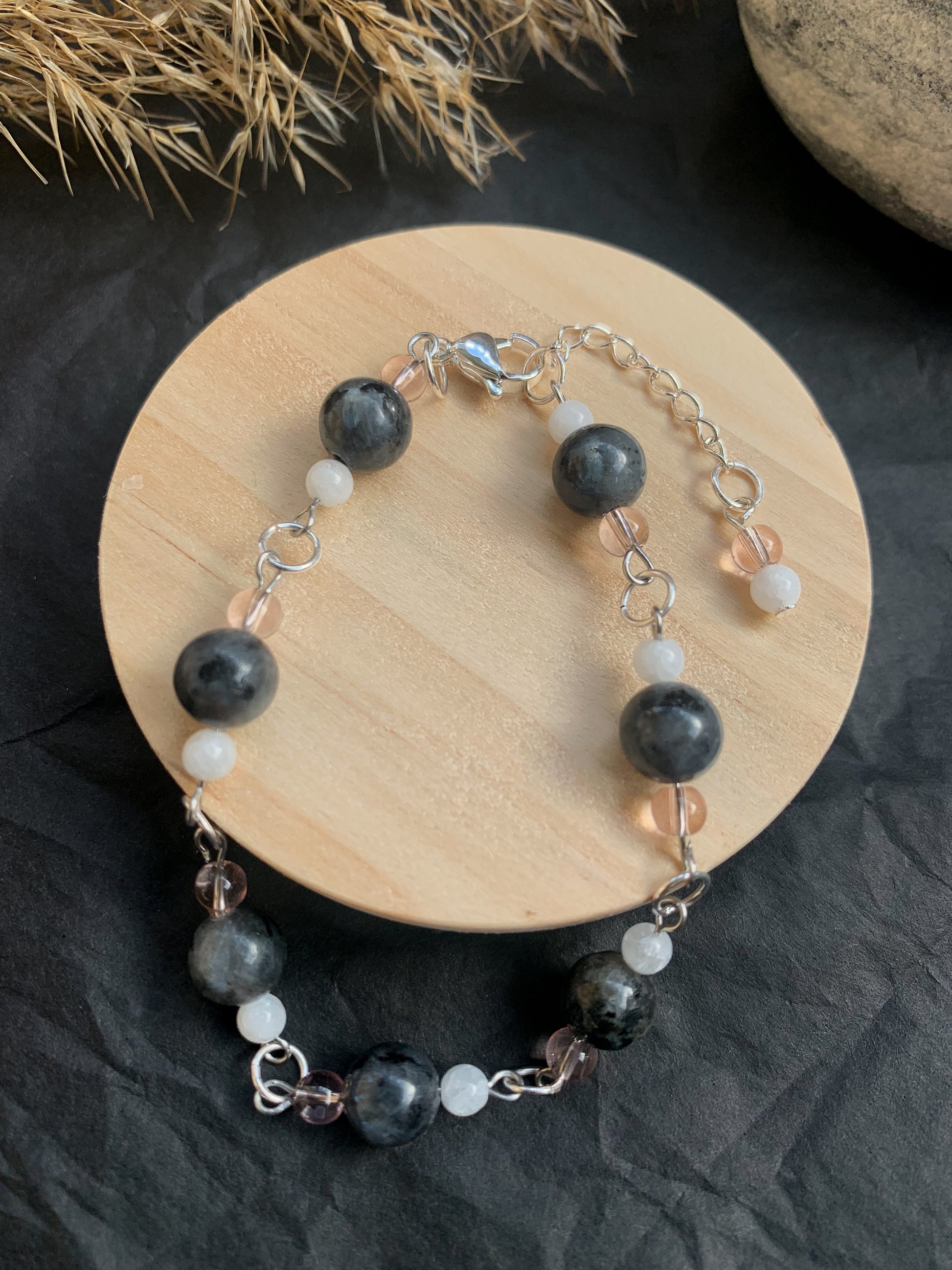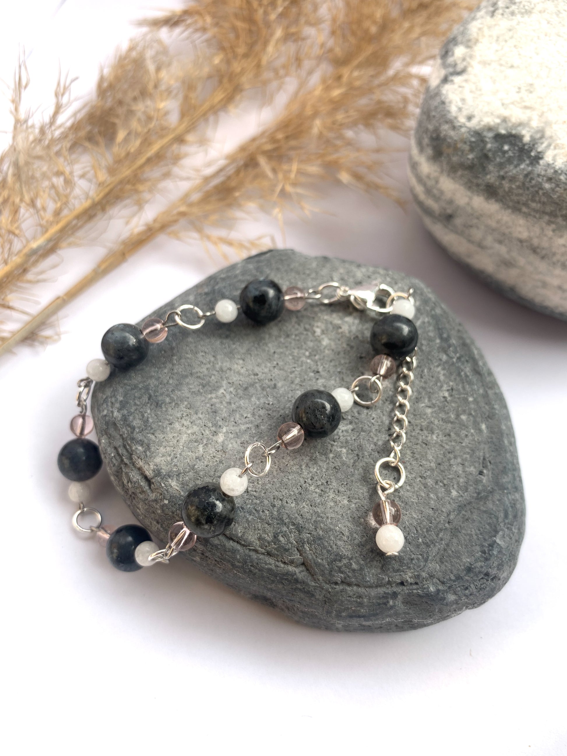 Korussa on käytetty aitoja luonnonjalokiviä; Larvikiittia, valkoista Jadea ja kristallia. Metalliosat ovat laadukasta ja allergisoimatonta kirurgin terästä ja/tai korumetallia.