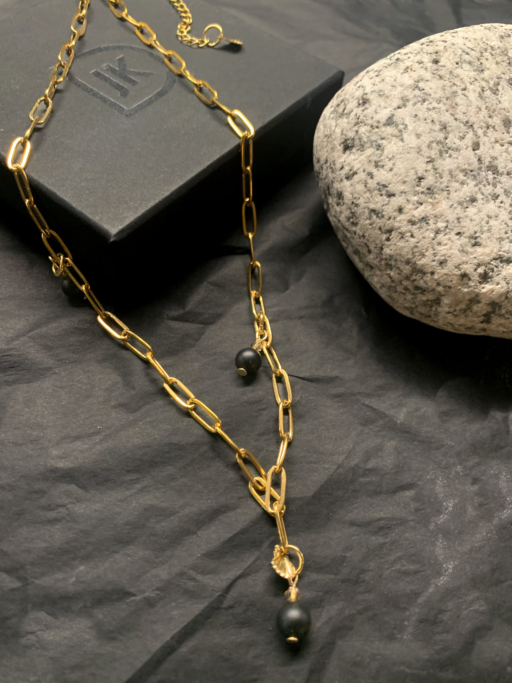 Korussa on käytetty aitoja luonnonkiviä; Akaattia. Metalliosat ovat laadukasta allergisoimatonta kirurgin terästä 304, kultaus PVD 18k.